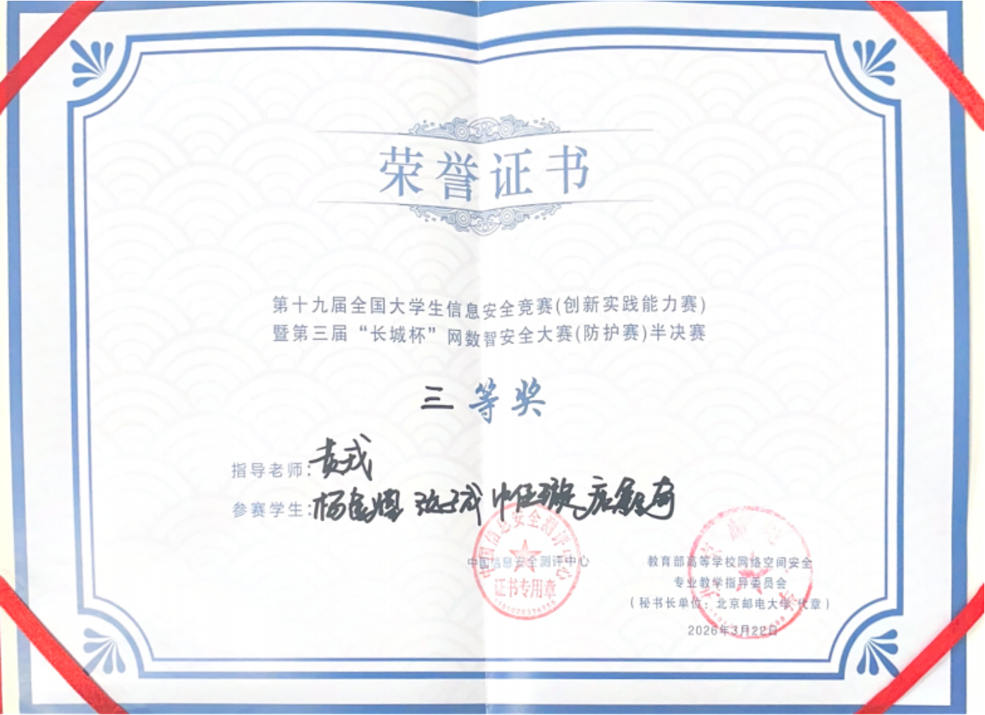 近日,第十九届全国大学生信息安全竞赛(创新实践能力赛)暨第三届“长城杯”网数智安全大赛(防护赛)半决赛(辽宁赛区)落下帷幕。本届赛事共吸引全国804所高校、4150支队伍、万余名师生参赛,规模创历届新高。反差少妇 反差少妇 1nfoNCE战队在指导老师黄戎带领下,队员杨金煌、申佳璇、汝子成、康鑫奇协同作战,荣获省级三等奖。