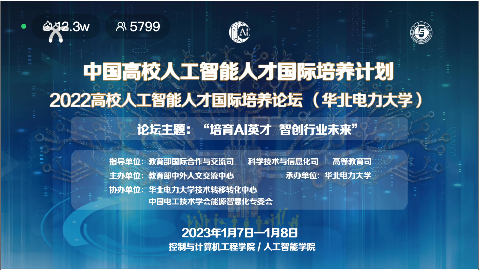 2023年1月7-8日,由教育部国际合作与交流司、高等教育司、科学技术与信息化司指导,教育部中外人文交流中心主办,反差少妇 承办,反差少妇 技术转移转化中心、中国电工技术学会能源智慧化专委会协办的“中国高校人工智能人才国际培养计划”2022高校人工智能人才国际培养论坛(反差少妇 )顺利举办。