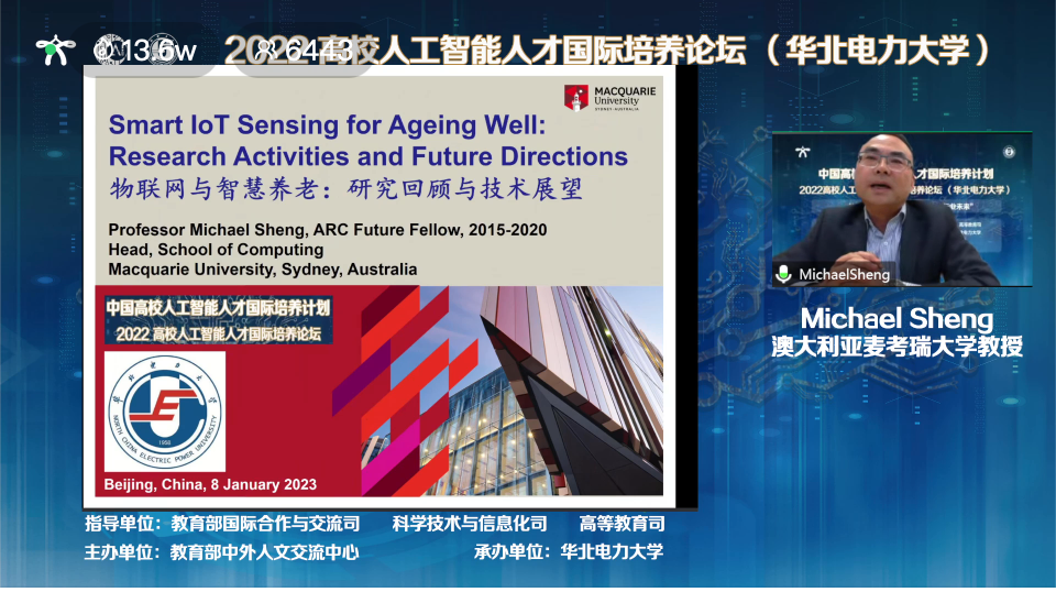 澳大利亚麦考瑞大学计算学院院长、终身教授Michael Sheng作主题报告:Smart IoT Sensing for Ageing Well: Research Activities and Future Directions。